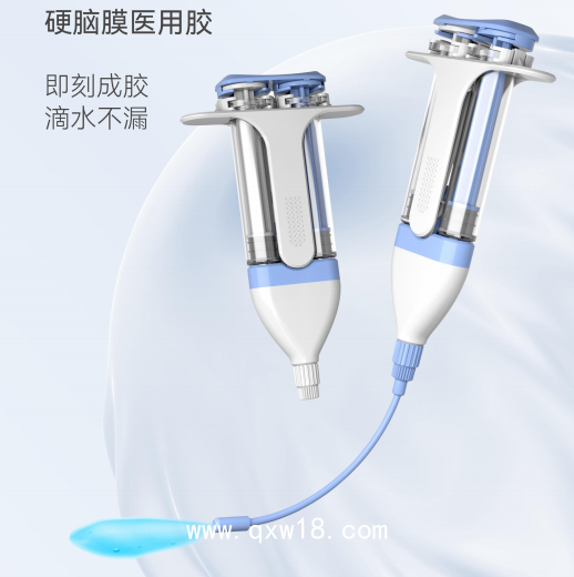 由合成材料組成,混合后發(fā)生親電親核反應(yīng),形成不熱不硬的具有空間立體網(wǎng)絡(luò)結(jié)構(gòu)的可降解水凝膠。適用于開顱手術(shù)中,硬腦膜縫合部位的輔助封合,防止腦脊液滲漏。
