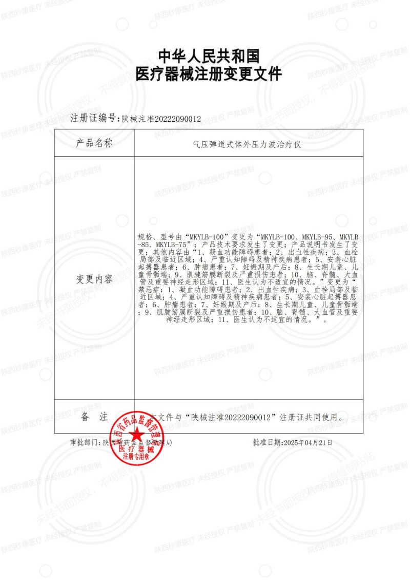 備注 | 本文件與“陜械注準(zhǔn)20222090012《氣壓彈道式體外壓力波治療儀》醫(yī)療器械注冊(cè)證”共同使用。 |