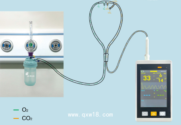 與供氧裝置連接,可供臨床輸氧用,同時可進行呼氣末二氧化碳采集。