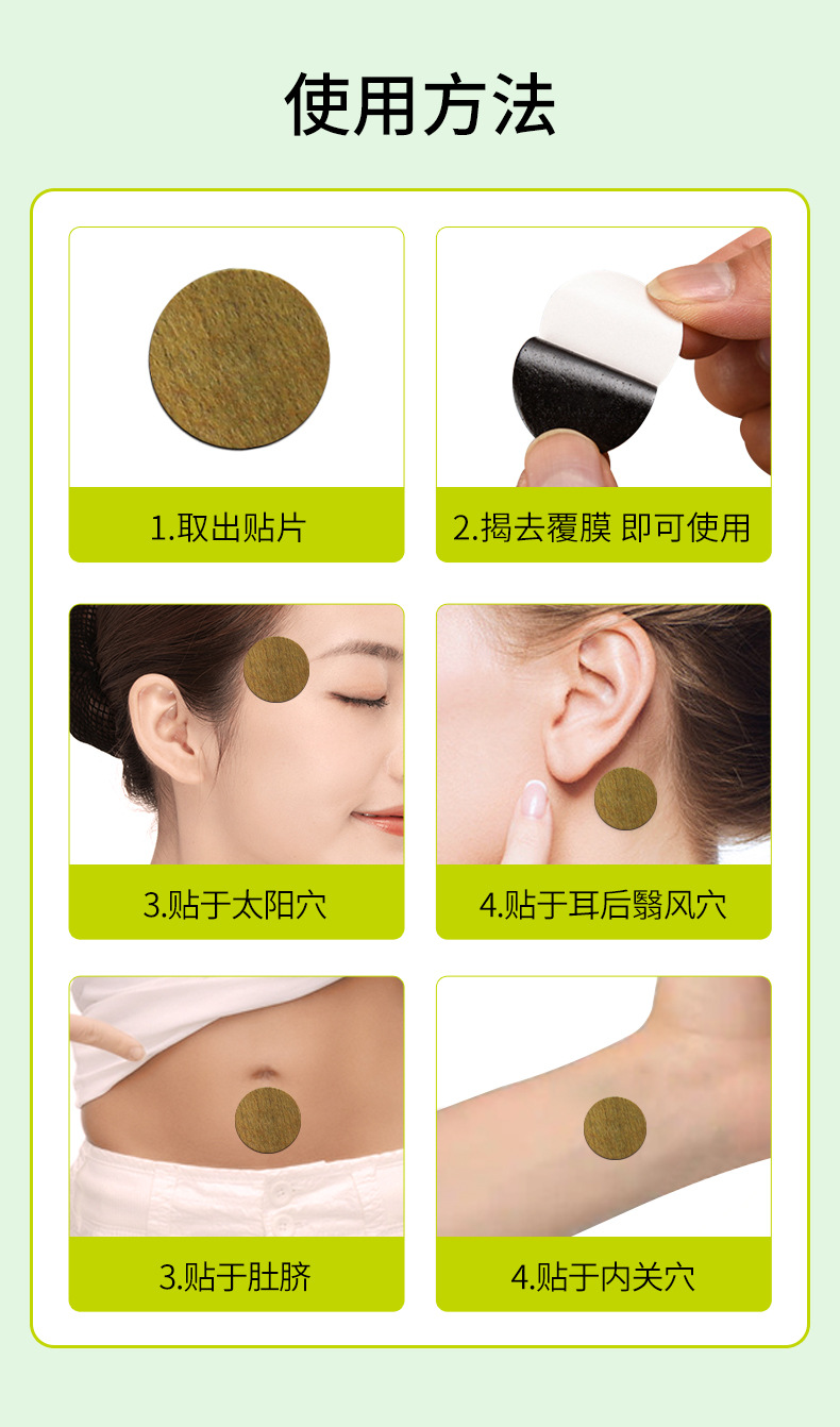 方便攜帶及使用,貼于耳后穴位,刺激體內(nèi)相關(guān)神經(jīng),幫助平衡中樞神經(jīng)系統(tǒng)。