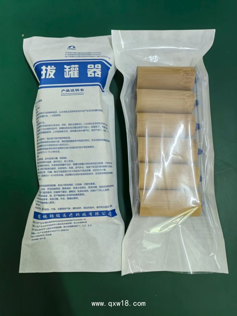 桂林鋯銘醫(yī)療科技有限公司生產(chǎn)的一次性竹罐選用天然優(yōu)質(zhì)竹子,經(jīng)現(xiàn)代先進工藝加工而成。相較于傳統(tǒng)竹罐,其具有使用方便、衛(wèi)生安全、規(guī)格統(tǒng)一等顯著特點。在制作過程中,通過嚴格的高溫蒸汽碳化處理、安裝單向閥門等工序,是國家一類醫(yī)療器械(桂桂械備20250005),為一次性使用產(chǎn)品,可有效避免了交叉感染風險。同時,依據(jù)人體不同部位特點,設計了多種規(guī)格的竹罐,能夠更好地貼合患者身體輪廓,增強治療效果。一次性拔罐器可先用藥煮→拔到人體→開放單向閥或按罐邊→即可取下→實施藥物罐療??蛇B拔中醫(yī)拔罐治療儀,利用電動產(chǎn)生的負壓來實現(xiàn)中醫(yī)閃罐、走罐。