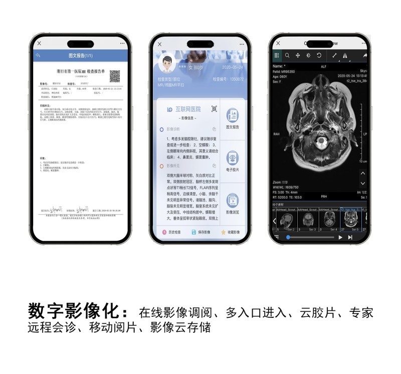 1.數(shù)字影像服務(wù)(云膠片):取代傳統(tǒng)物理膠片,通過(guò)二維碼為患者提供包含原始影像(DICOM 3.0)和電子報(bào)告的數(shù)字影像存儲(chǔ)和傳輸服務(wù),支持隨時(shí)調(diào)閱、分享與長(zhǎng)期存儲(chǔ),提升就醫(yī)便捷性。