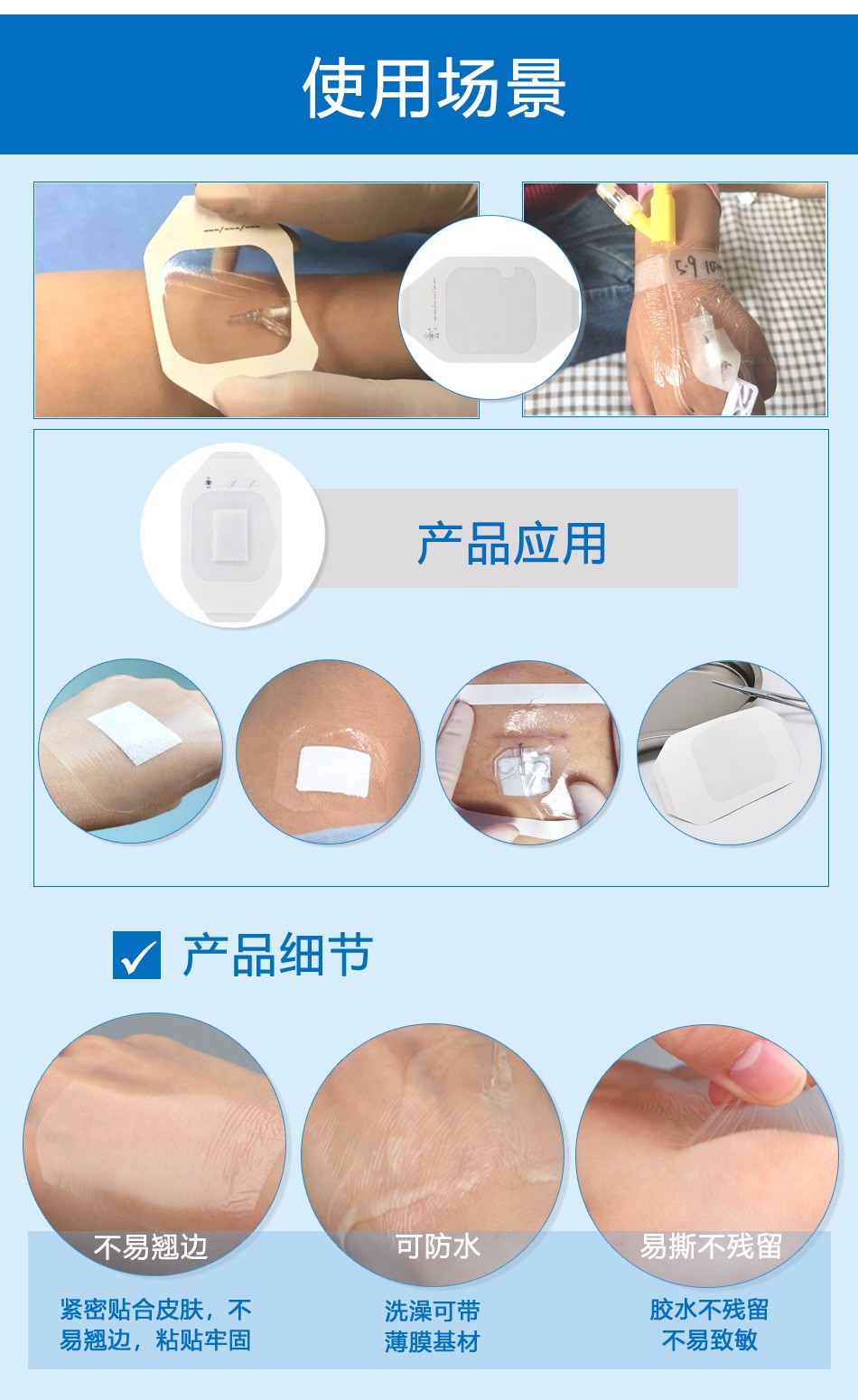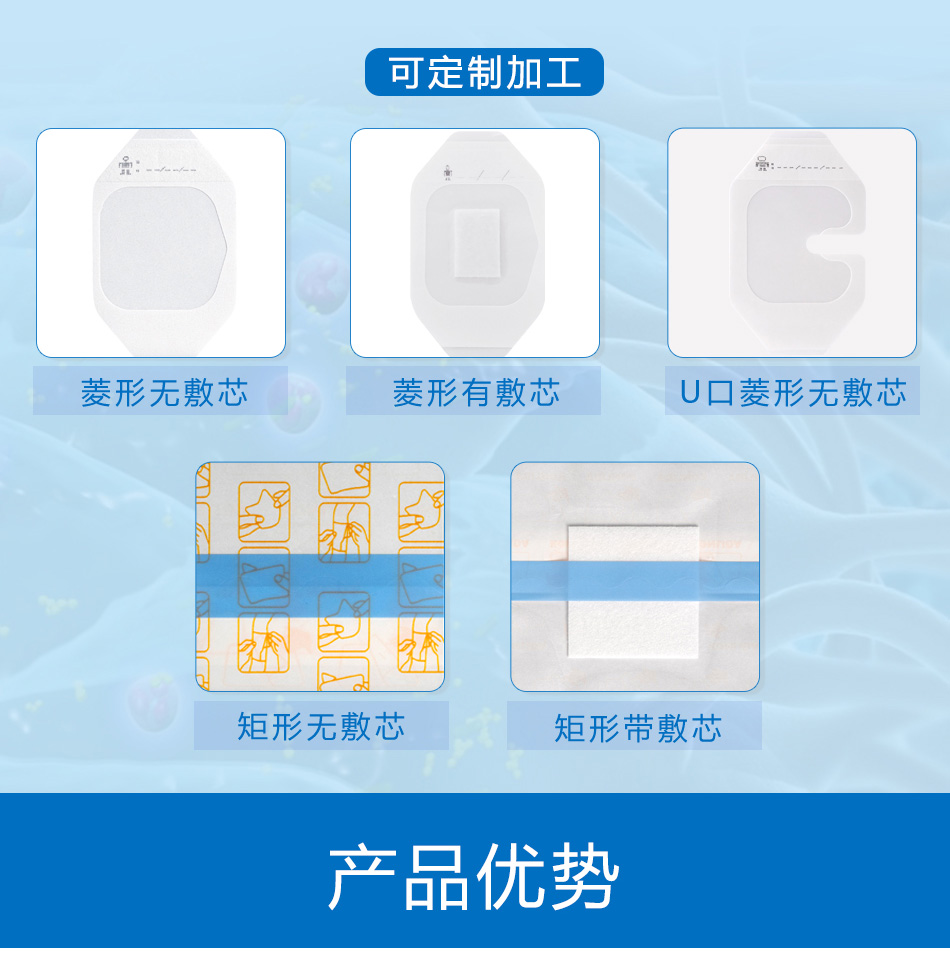 帶敷芯型用于非慢性創(chuàng)面 如淺表性創(chuàng)面、手術(shù)后縫合創(chuàng)面、機(jī)械創(chuàng)傷、小創(chuàng)口、擦傷、切割傷創(chuàng)面、穿刺器械的穿刺部位、I度或淺II度的燒燙傷創(chuàng)面、嬰兒肚臍口創(chuàng)口、激光/光子/果酸換膚/微整形術(shù)后創(chuàng)面)的護(hù)理,為創(chuàng)面愈合提供微環(huán)境。無(wú)敷芯型用于對(duì)穿刺器械(如導(dǎo)管)的穿刺部位的護(hù)理并固定穿刺器械。