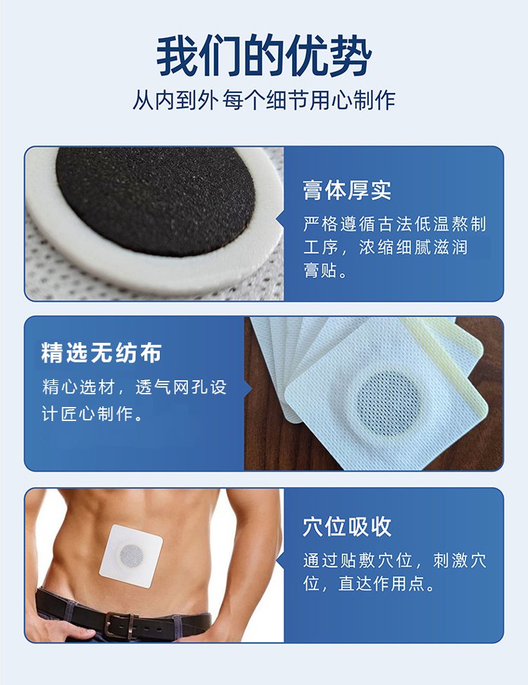1. ?外用,僅限下腹部前列腺對(duì)應(yīng)穴位貼敷使用,嚴(yán)禁口服,避免接觸眼睛、口腔等黏膜部位及皮膚破損處。使用前洗凈雙手,清潔下腹部貼敷區(qū)域皮膚,用干凈毛巾擦干,確保皮膚干爽無(wú)油脂、無(wú)污物,去除表面多余毛發(fā),提升貼敷穩(wěn)固性。