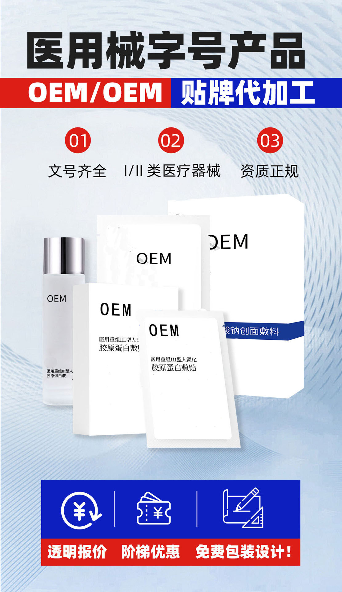 在貼牌代加工業(yè)務(wù)上,公司針對(duì)膠原蛋白敷料貼、醫(yī)用修復(fù)敷料等產(chǎn)品提供一站式定制服務(wù),可滿足客戶從成分配方研發(fā)、基材選型、規(guī)格定制、無(wú)菌包裝設(shè)計(jì)到合規(guī)備案、批量生產(chǎn)的全流程需求。配備專業(yè)技術(shù)團(tuán)隊(duì)與合規(guī)顧問(wèn),靈活適配不同訂單規(guī)模,支持免費(fèi)打樣、快速出貨,助力合作伙伴快速推出市場(chǎng)競(jìng)爭(zhēng)力強(qiáng)的產(chǎn)品。公司始終堅(jiān)守“品質(zhì)為先、無(wú)菌安全、合作共贏”的經(jīng)營(yíng)理念,賦能醫(yī)用肌膚修復(fù)領(lǐng)域發(fā)展。