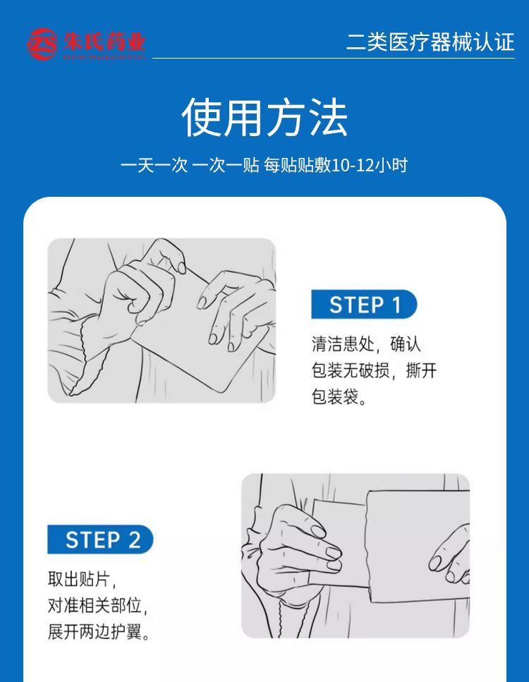 【使用說明】清潔患處,確認包裝無破損后,打開包裝,將貼劑的隔離膜撕去,貼于患處,每 24 小時更換一次。