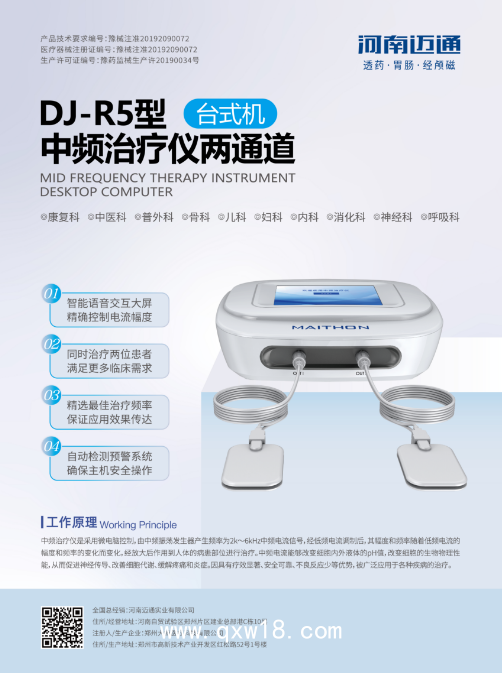 此外,中頻治療儀還可以通過調(diào)節(jié)神經(jīng)元反射抑制神經(jīng)元,使其興奮性下降,從而起到調(diào)節(jié)神經(jīng)的作用,主要用于治療植物神經(jīng)紊亂、神經(jīng)官能癥、神經(jīng)衰弱等疾病中頻治療儀的全稱為低頻調(diào)制中頻治療儀,是應(yīng)用被低頻電流調(diào)制后的中頻電流來治療疾病的儀器,該電流幅度和頻率隨著低頻電流的幅度和頻率的變化而變化,兼有低頻電與中頻電兩種電流各自的特點和治療作用,作用較深,不產(chǎn)生電解刺激的作用,人體易于接受而容易產(chǎn)生適應(yīng)證但使用時應(yīng)遵循專業(yè)指導(dǎo),以確保安全和有效。