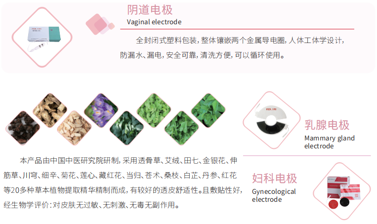 乳腺/婦科電極:本產(chǎn)品由中國中醫(yī)研究院研制,采用透骨草、艾絨、田七、金銀花、伸筋草、川穹、細辛、菊花、蓮心、藏紅花、當歸、蒼術(shù)、桑枝、白芷、丹參、紅花等20多種草本植物提取精華精制而成,有較好的透皮舒適性。且敷貼性好,經(jīng)生物學評價:對皮膚無過敏、無刺激、無毒。