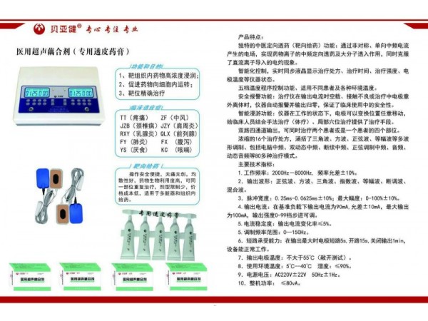 產(chǎn)品說明:中醫(yī)定向透藥治療儀是根據(jù)中國傳統(tǒng)中醫(yī)理論,結(jié)合人體經(jīng)絡(luò)學,生物物理學及現(xiàn)代數(shù)字電子技術(shù),離子導入技術(shù)研制開發(fā)的高科技新產(chǎn)