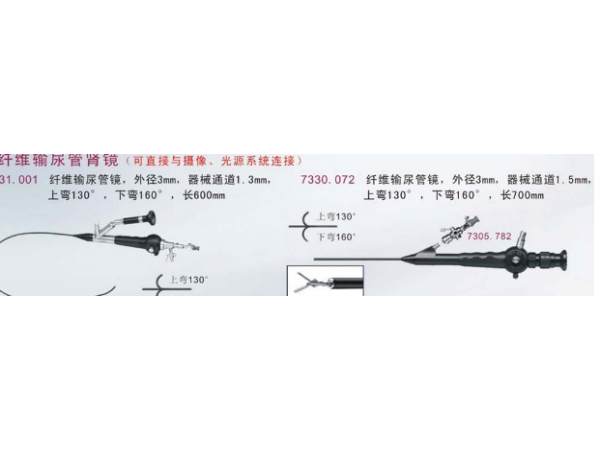 產(chǎn)品說明:纖維輸尿管鏡7331.001外徑3mm,器械通道1.3mm,上彎130o,下彎160o,長600mm7330.072外徑3mm,器械通道1.3mm,上彎130o,下彎