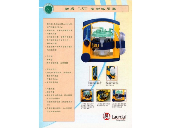 產(chǎn)品說(shuō)明:品牌:Laerdal(挪度)產(chǎn)地:挪威產(chǎn)品型號(hào):Laerdal LSU電動(dòng)吸引器參數(shù):吸引器車載與攜帶兩用、壁掛、充電式電動(dòng)吸引器工作條件