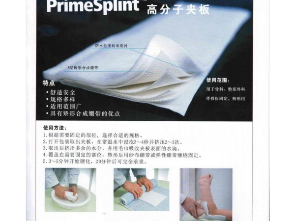 產(chǎn)品說明:【產(chǎn)品結(jié)構(gòu)及適用范圍】成分: 該產(chǎn)品由防水性無紡布底襯和8層矯形合成繃帶構(gòu)成。臨床應用:主要用于骨科及手足外科骨折及韌帶、肌